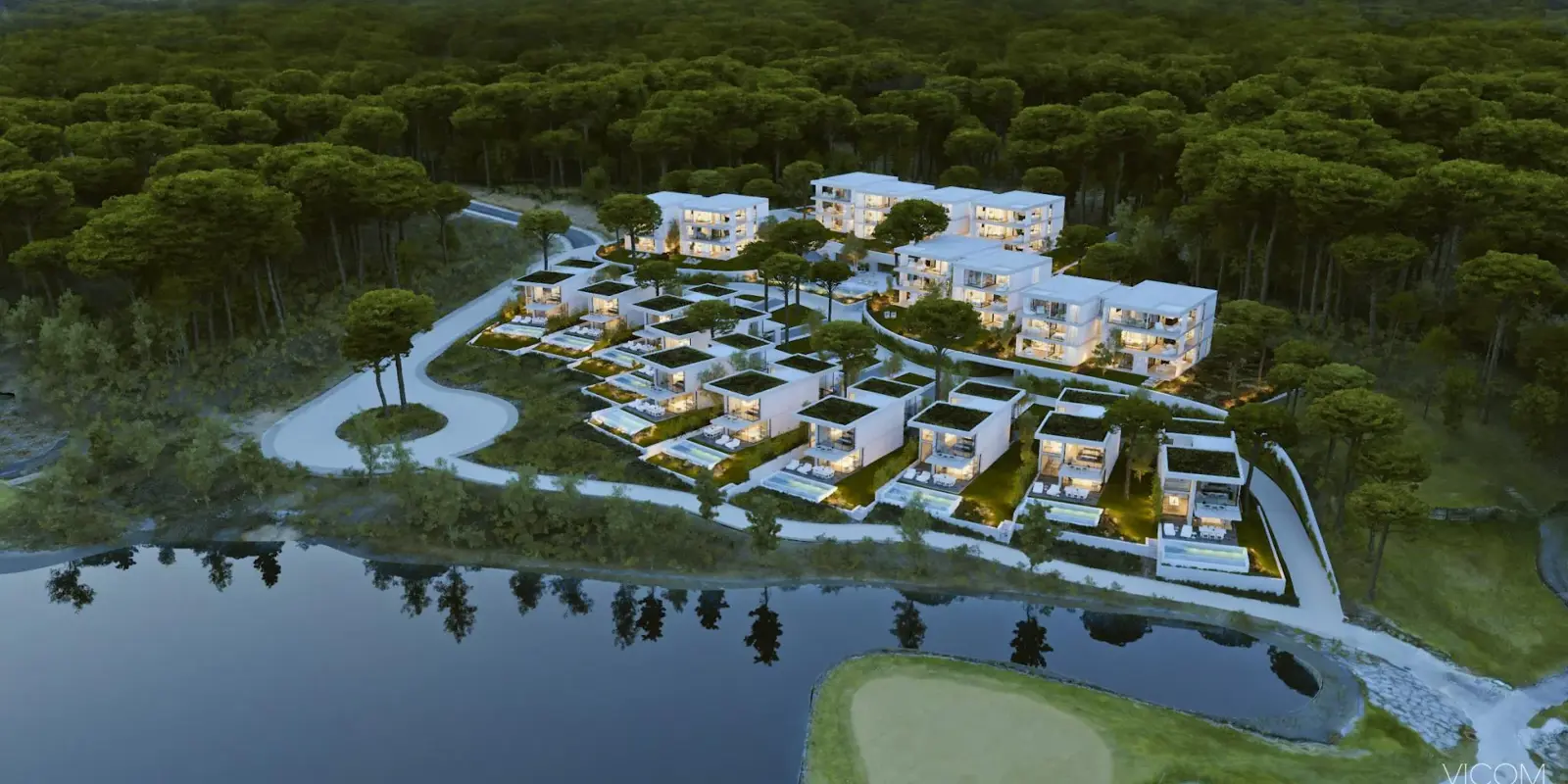 Estan distribuïts al voltant d'una piscina elegant que està dissenyada per imitar l'aparença d'un llac, cosa que augmenta encara més la sensació natural de tot el complex. Cada apartament de 3 habitacions compta amb un espai d'estar de planta oberta, finestres de pis a sostre que porten aquest bell paisatge natural directament a la casa i una àmplia terrassa on podeu relaxar-vos i gaudir de les vistes.