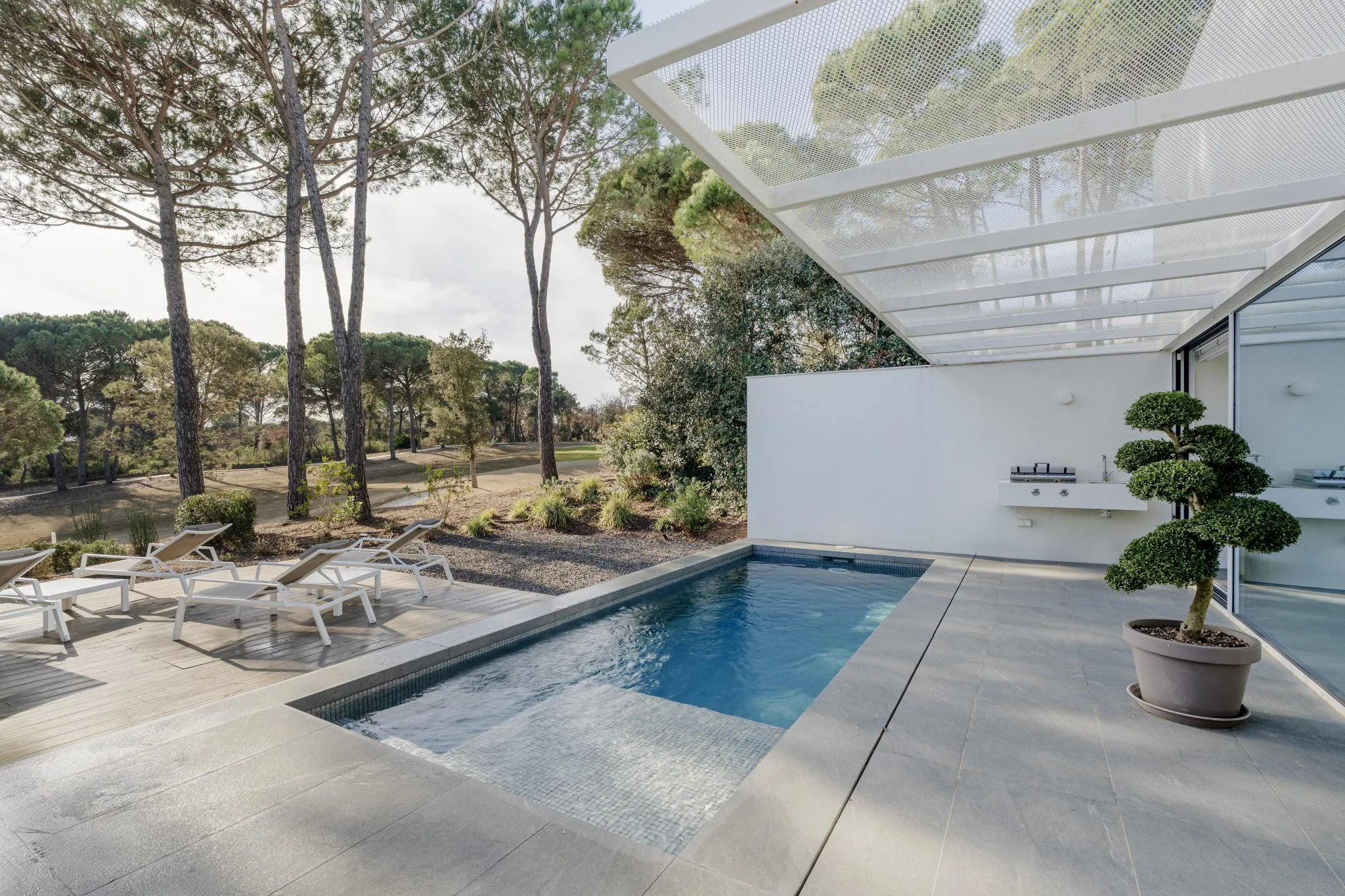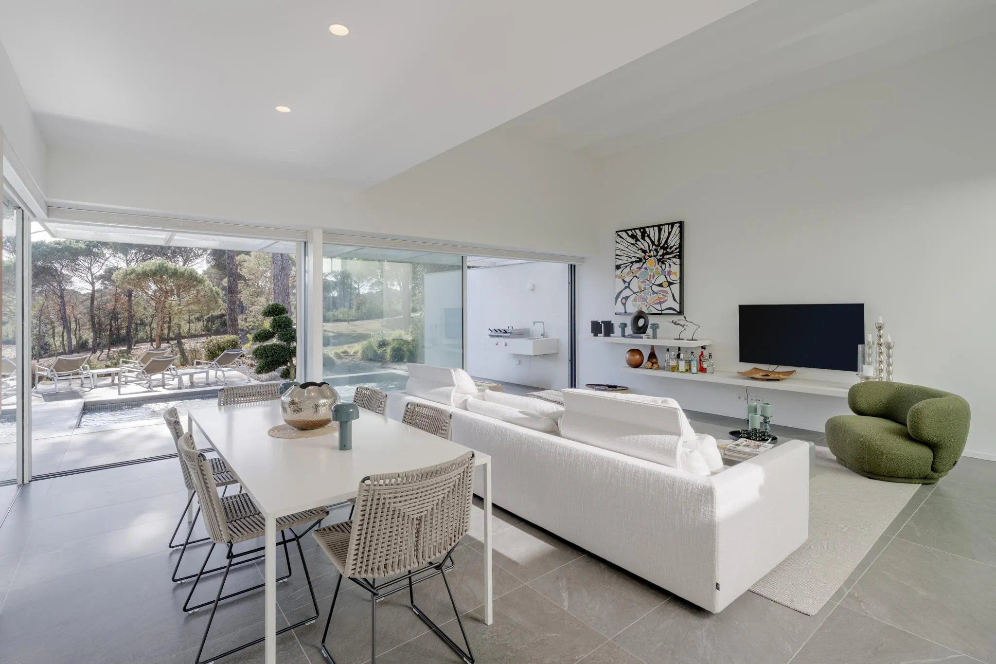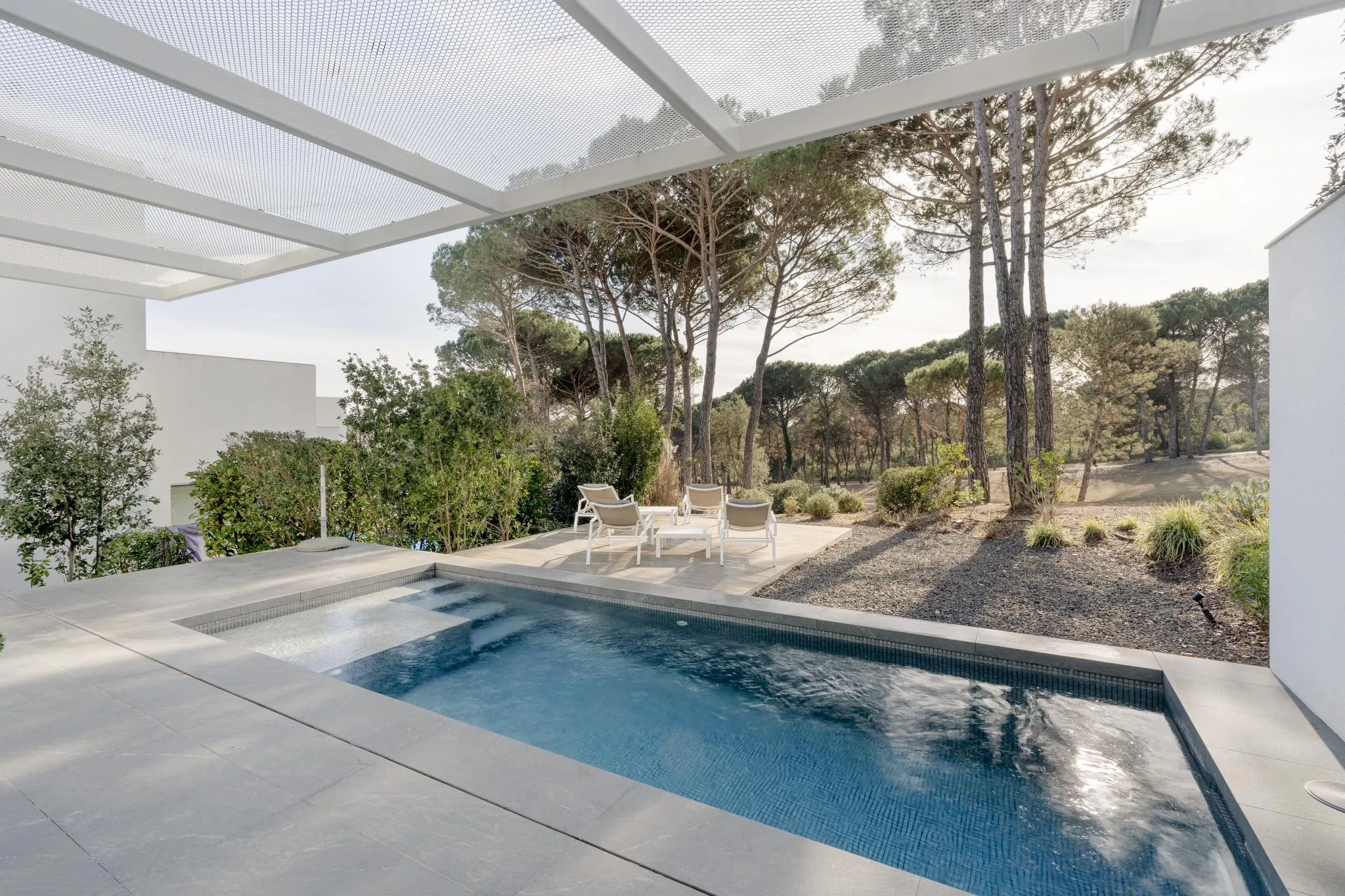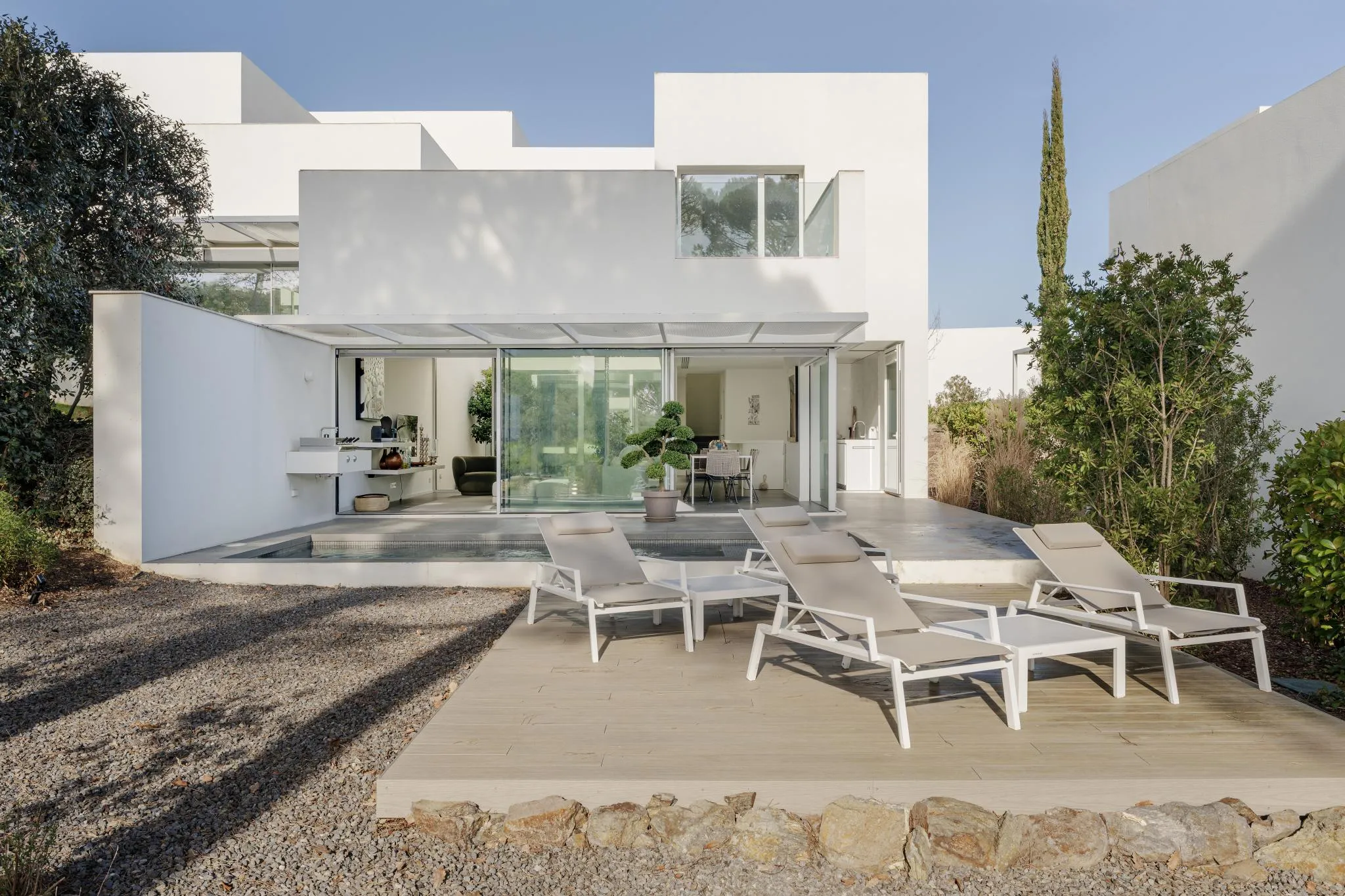 Les línies netes i angulars de l’arquitectura es realcen amb grans finestrals de terra a sostre que difuminen la frontera entre l’interior i l’exterior, permetent que la llum natural inundi els espais al llarg del dia. Les zones d’estar, organitzades en una acurada planta oberta en forma de L, ofereixen un entorn ideal tant per a la vida familiar com per rebre convidats.