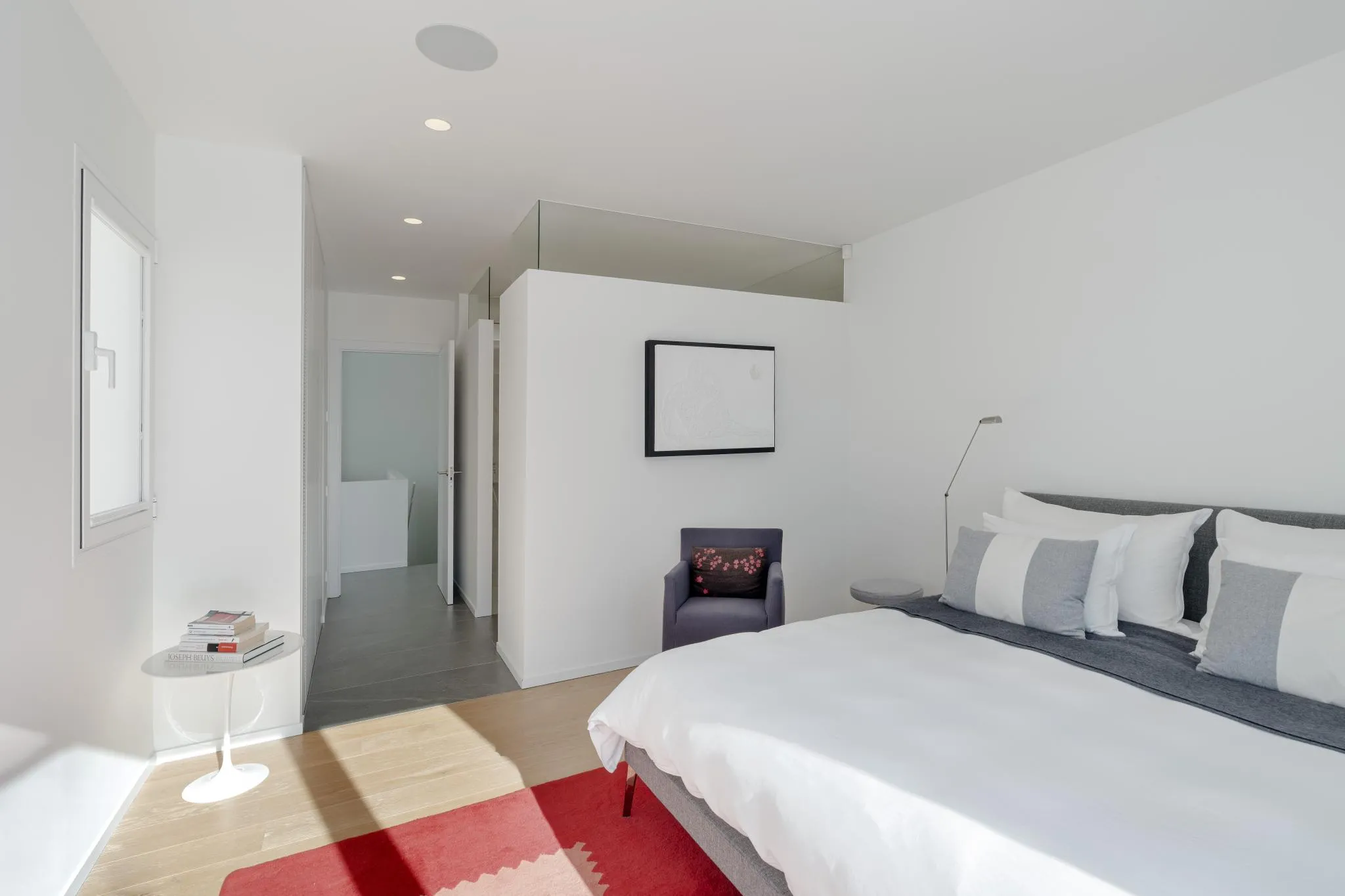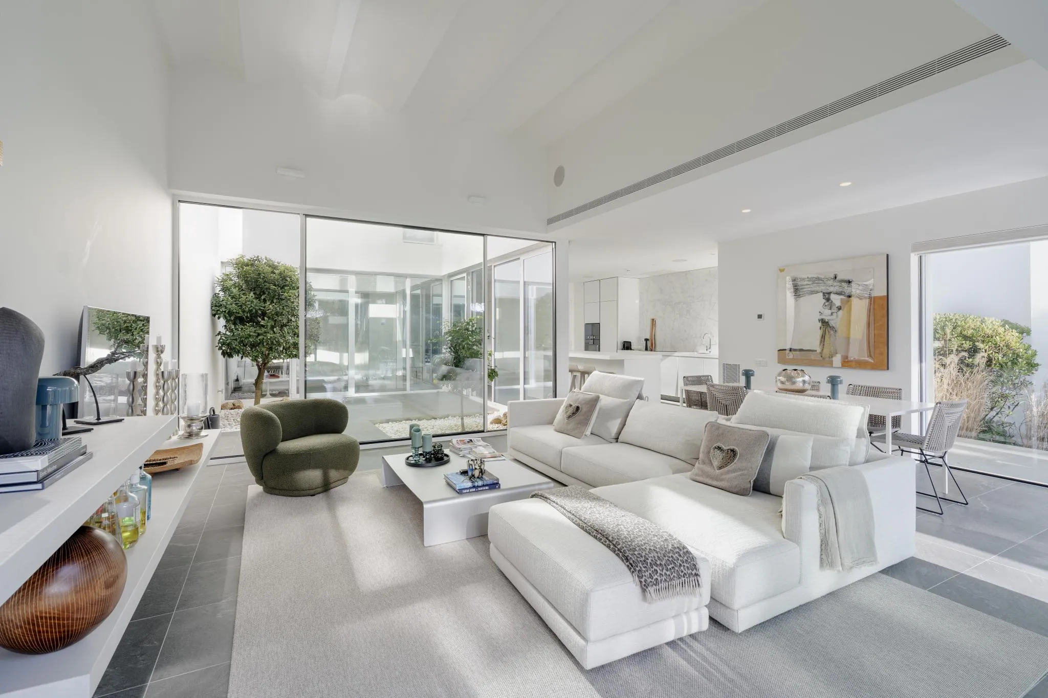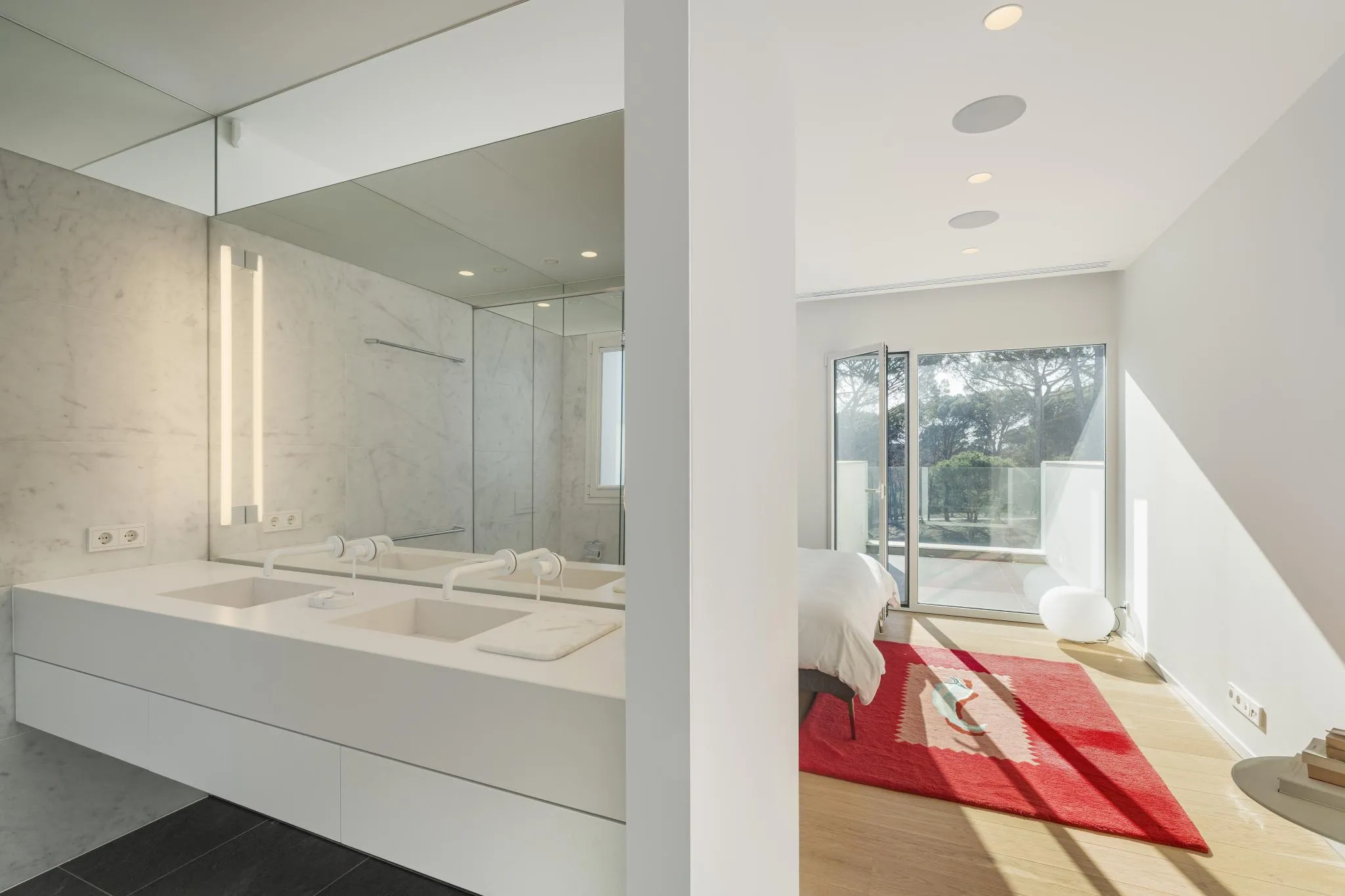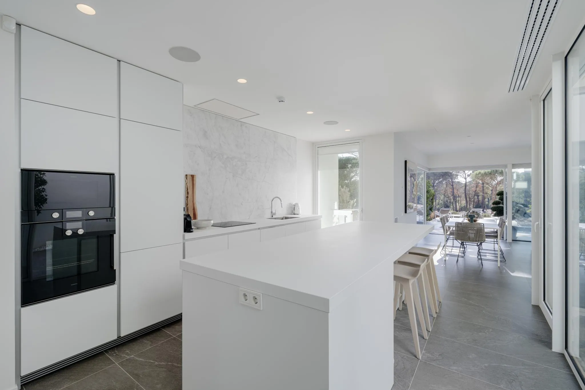 Les línies netes i angulars de l’arquitectura es realcen amb grans finestrals de terra a sostre que difuminen la frontera entre l’interior i l’exterior, permetent que la llum natural inundi els espais al llarg del dia. Les zones d’estar, organitzades en una acurada planta oberta en forma de L, ofereixen un entorn ideal tant per a la vida familiar com per rebre convidats.