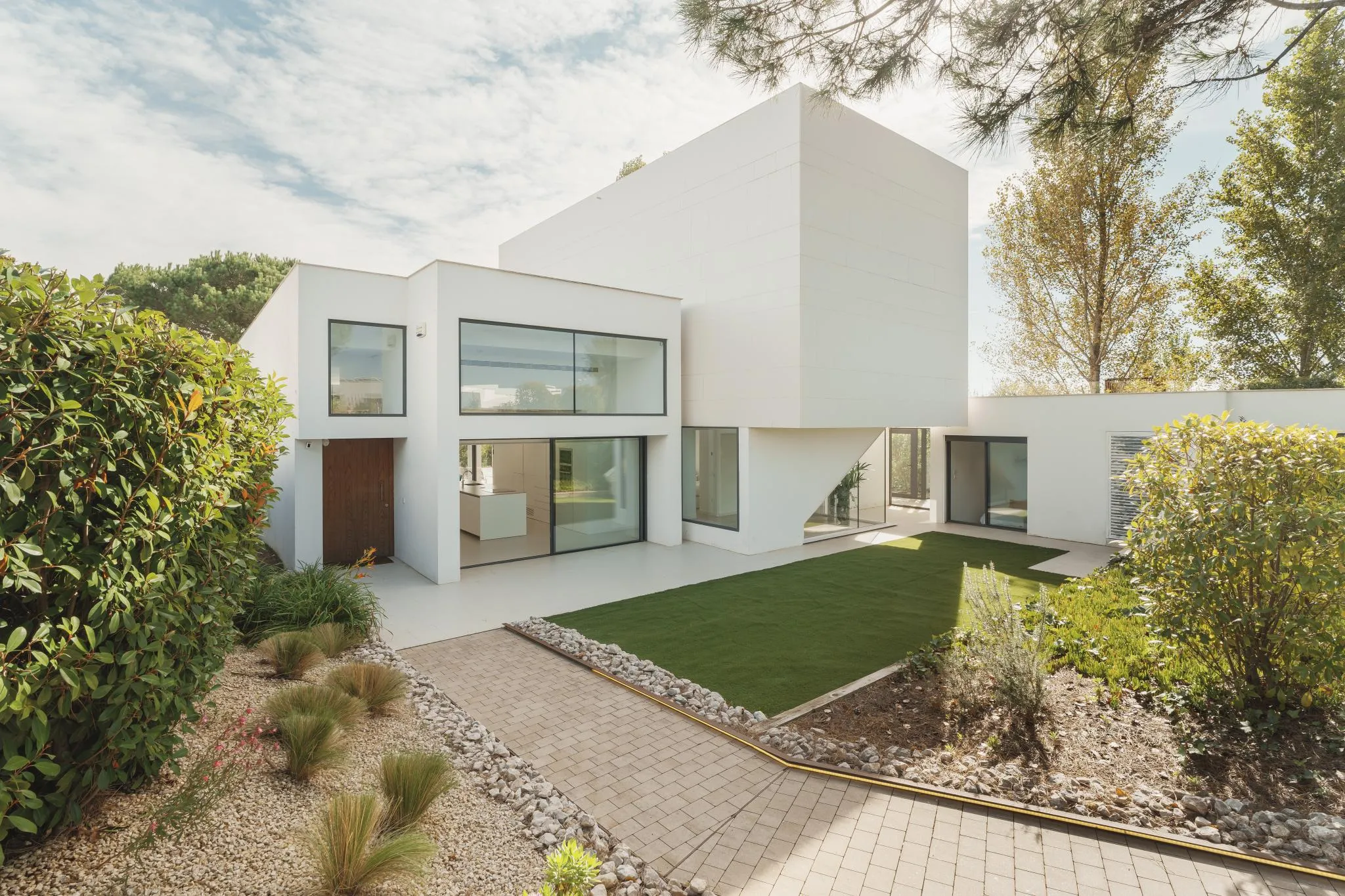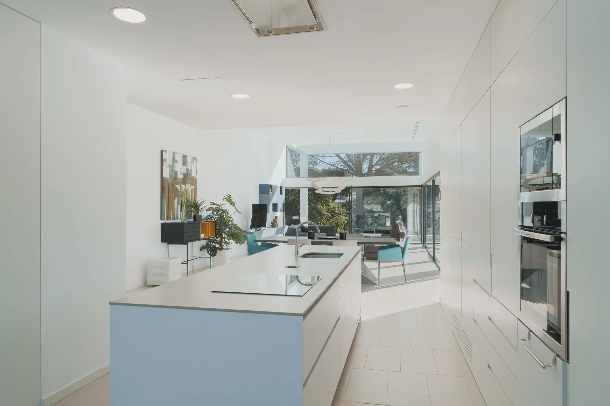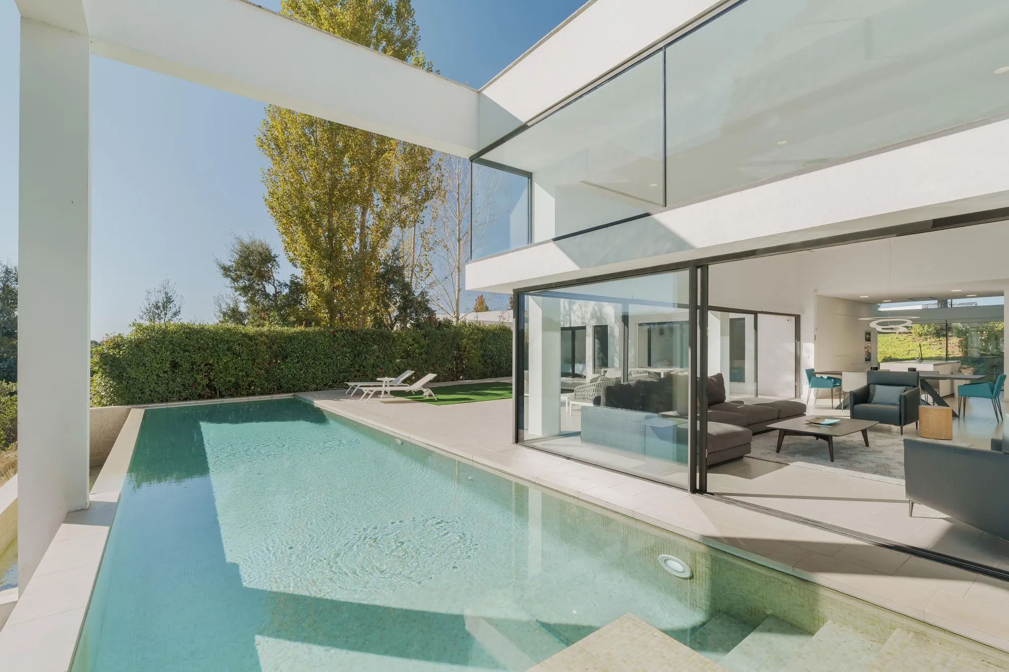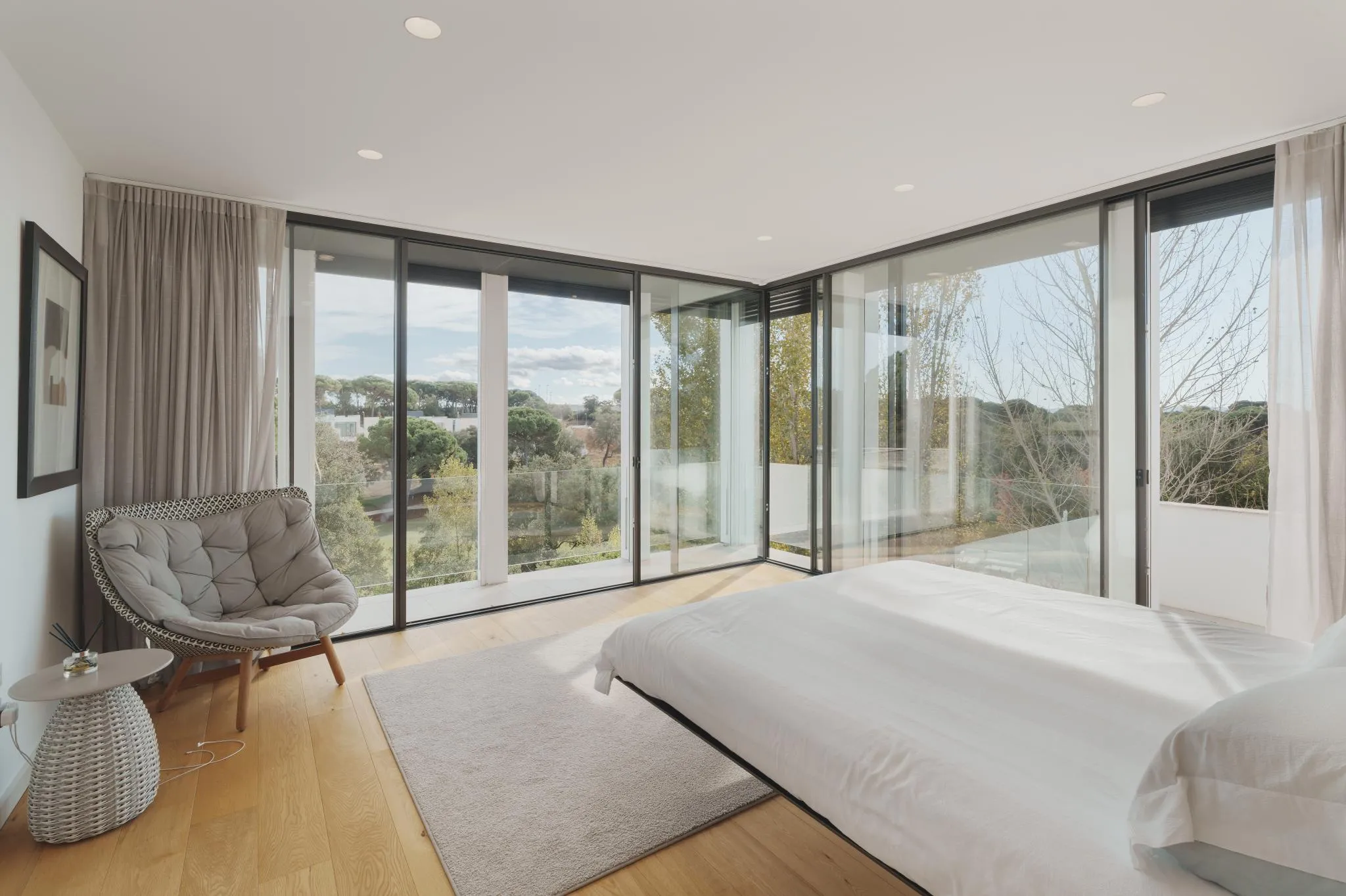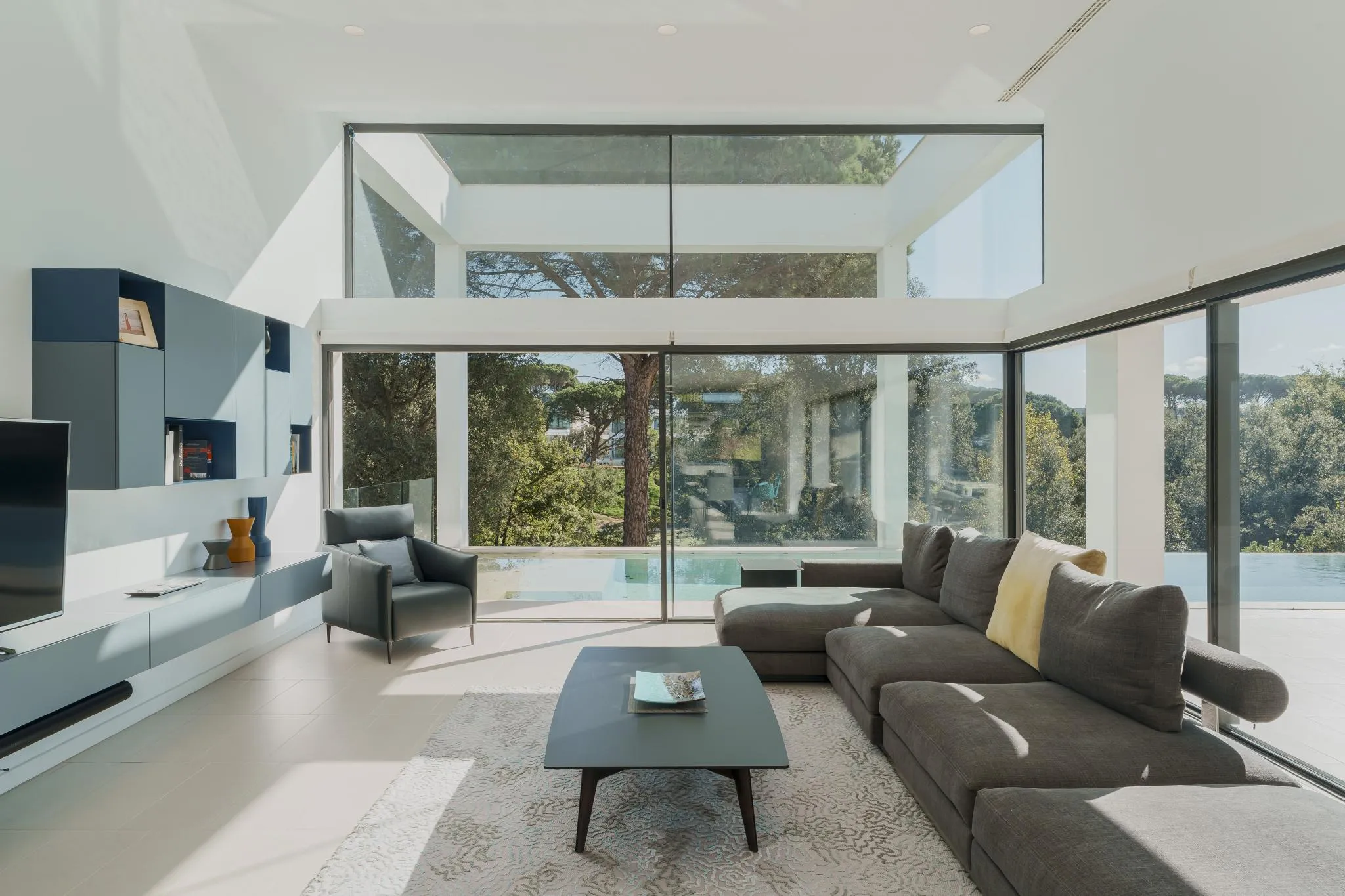 Mit 277 m² sorgfältig gestalteter Innenräume verbindet das Haus Licht, Raum und Komfort zu einem perfekten Gleichgewicht. Der großzügige Wohnbereich ist von raumhohen Glasfronten umgeben, die sich zur Terrasse und zum Pool öffnen und so einen fließenden Übergang zwischen Innen- und Außenbereichen schaffen.