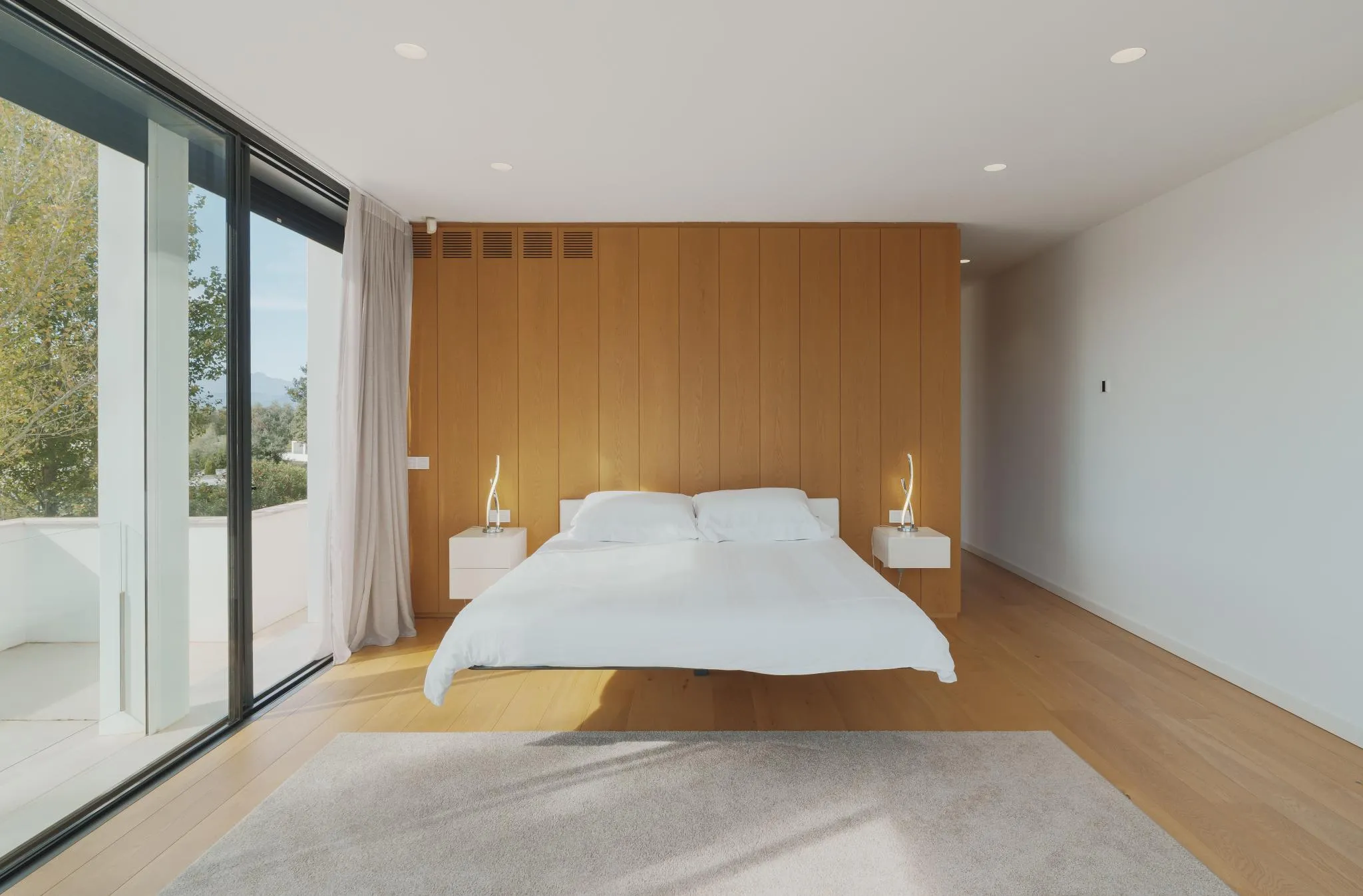 Die Master Suite nimmt das gesamte Obergeschoss ein und bietet Panoramablick sowie eine private Terrasse. Zwei weitere Schlafzimmer befinden sich im unteren Bereich, beide mit direktem Zugang zur Poolterrasse. La Selva 17 verfügt außerdem über eine Garage im Haus und einen flexibel nutzbaren Raum, der als viertes Schlafzimmer oder multifunktionaler Bereich gestaltet werden kann – je nach den Bedürfnissen des Eigentümers.