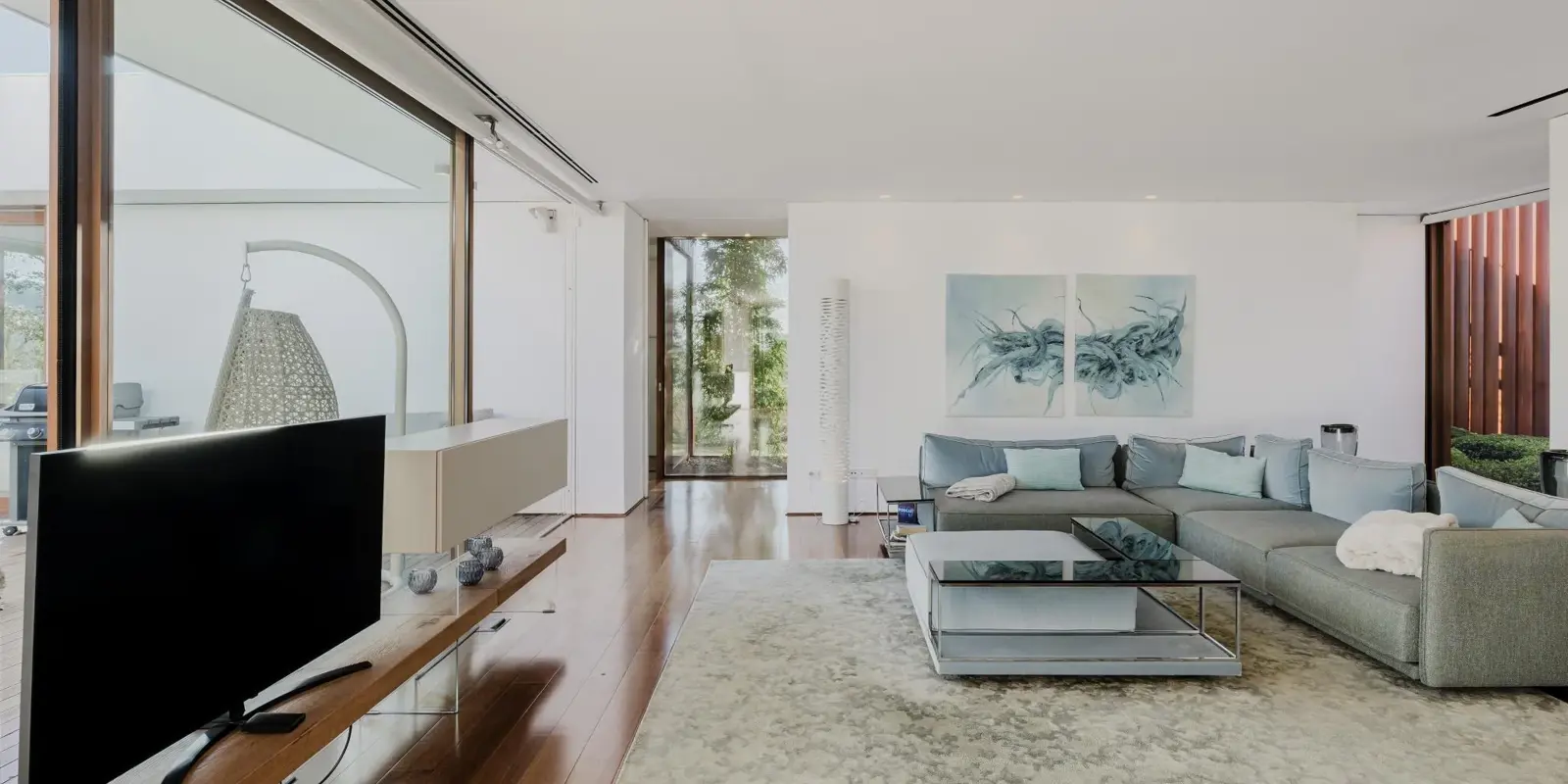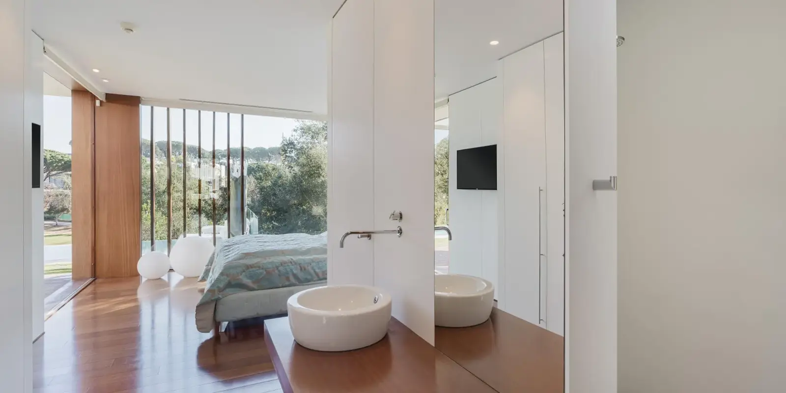 Die auf der rechten und linken Seite der Villa angeordneten Suiten bieten direkten Zugang zur zentralen Terrasse sowie zum Garten mit atemberaubendem Pool. Ein drittes Doppelschlafzimmer mit angrenzendem Gästebadezimmer befindet sich auf der gegenüberliegenden Seite.