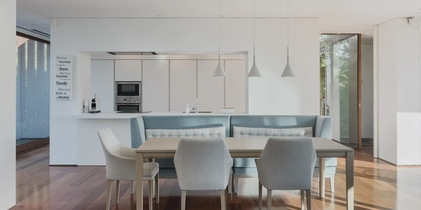 Die Inspiration für die „U-Selva“ liegt im mediterranen Stil römischer Villen. Der U-förmige Bungalow umschließt den in der Mitte liegenden Terrassenbereich. Der weitläufige, lichtdurchflutete Wohnbereich mit offener Bulthaup-Küche bildet den Hausmittelpunkt.