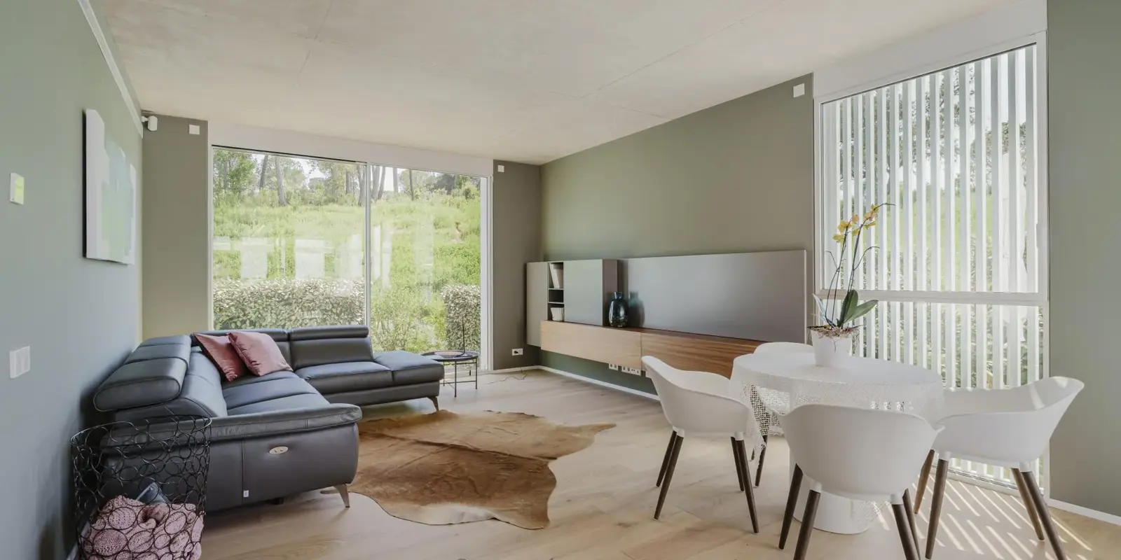 Inside, the 116 m² layout offers three comfortable bedrooms and two modern bathrooms, including a serene master suite. The open-plan living and dining area is framed by floor-to-ceiling windows that bathe the interior in sunlight and open directly to the garden, making it ideal for both entertaining and quiet moments.