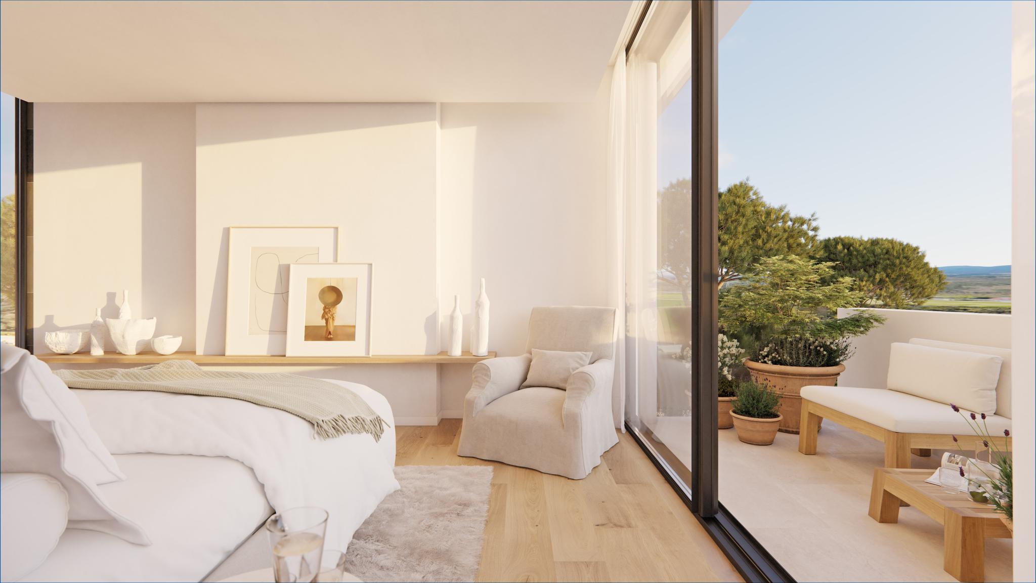 El detalle distintivo de esta casa se observa al subir la exquisita escalera de hierro, que da al dormitorio principal, con ventanales del suelo al techo con vistas al recorrido del campo de golf.
