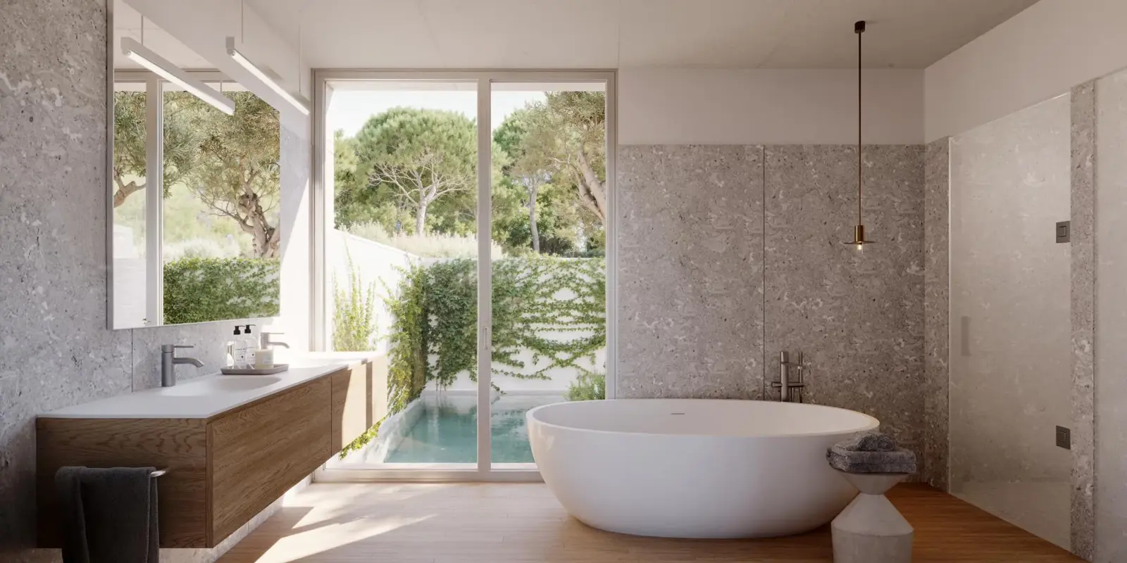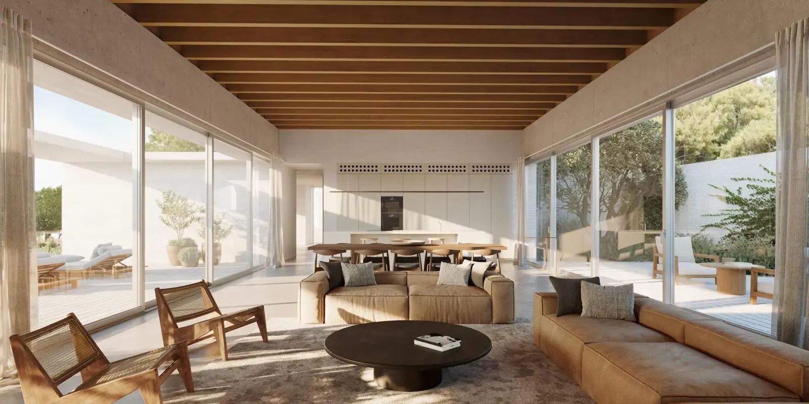 Chaque chambre dispose de sa propre salle de bain, et les espaces communs spacieux, comprenant une cuisine ouverte, une salle à manger et un salon, en font le lieu idéal pour recevoir des invités et profiter de moments de détente en plein air sur la grande terrasse.